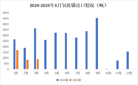據(jù)海關統(tǒng)計數(shù)據(jù)顯示,2025年3月中國氧化銻出口量為901.0噸,環(huán)比上升7.3%,同比下降75.2%;1-3月氧化銻出口量為3447.8噸,同比下降58.0%。