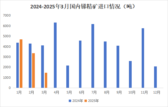 據(jù)海關統(tǒng)計數(shù)據(jù)顯示,2025年3月中國銻礦砂及精礦進口量為1483.0噸,環(huán)比下降55.8%,同比下降63.9%;1-3月銻礦砂及精礦進口量為9530.2噸,同比下降25.5%。